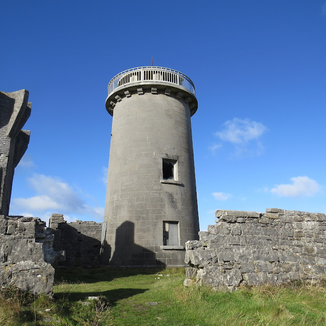 Well, the light is no longer painted white - not a trace of paint remains. Approaching it, a large sign says that Dun Arann is closed for renovations but there was no sign of any renovation work going on when I was there. There are large holes in the wall where you simply walk into the compound. Considering it has been abandoned for 160 years, the tower itself looks in a great structural state. The lantern of course has been removed and the surrounding buildings are in various stages of demolition but the tower looks great. The door has been replaced by a piece of metal and iron railings. Peering inside one of the windows, the inside staircase appears intact.